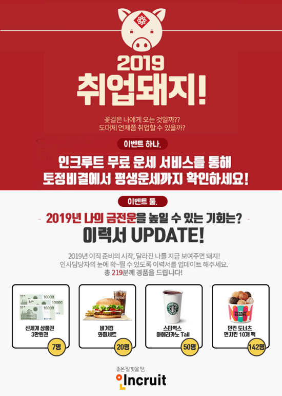 »õÇØ¸¦ ¸ÂÀÌÇÏ¿© ¡®ÁÁÀº ÀÏ Ã£À» ¶©¡¯ Ãë¾÷Æ÷ÅÐ ÀÎÅ©·çÆ®(´ëÇ¥ ¼¹Ì¿µ www.incruit.com)¿¡¼ 2019³â ±âÇØ³â ¹«·á ¿î¼¼ ¼ºñ½º¸¦ Á¦°øÇÑ´Ù. ´Ü¼øÈ÷ Ãë¾÷¿î¼¼»Ó¸¸ ¾Æ´Ï¶ó 2019³â ÅäÁ¤ºñ°áÀ» ºñ·ÔÇØ Æò»ý¿î¼¼, Á÷Àå¿î, »ç¾÷¿î, ½ÃÇè¿î, ±ÝÀü¿î°ú ´õºÒ¾î ÀÏÀϿ¿Í ²ÞÇØ¸ù±îÁö ¸ðµÎ º¼ ¼ö ÀÖ´Ù. ƯÈ÷ Ãë¾÷¿î¼¼¿¡¼´Â ÀûÇÕÇÑ Ãë¾÷ºÐ¾ß¿Í ¿î¼¼¿¡ °¡Àå Àß ¸Â´Â ä¿ëÁ¤º¸, ´õ ³ª¾Æ°¡ Ãë¾÷¿îÀ» ³ô¿©ÁÖ´Â ¾ÆÀÌÅÛ±îÁö Àç¹Ì·Î ¾Ë¾Æº¼ ¼ö ÀÖ´Ù.