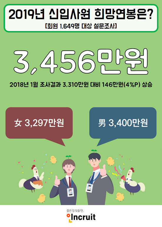 Ãë¾÷Æ÷ÅÐ ÀÎÅ©·çÆ®(´ëÇ¥ ¼¹Ì¿µ www.incruit.com) Á¶»ç°á°ú, 2019³â ½ÅÀÔ ±¸Á÷ÀÚµéÀÌ Èñ¸ÁÇÏ´Â ¿¬ºÀ Æò±ÕÀº 3õ 456¸¸¿øÀ¸·Î Áý°èµÆ´Ù. ÀÚ»ç ±¸Á÷ÀÚ È¸¿ø 1õ649¸íÀ» ´ë»óÀ¸·Î ¡®2019 ±¸Á÷ÀÚ Èñ¸Á¿¬ºÀ¡¯À» Á¶»çÇÑ °á°ú´Ù. ±×Áß ½ÅÀÔ ±¸Á÷ÀÚ´Â 612¸í Æ÷ÇԵǾî ÀÖ¾ú´Ù.