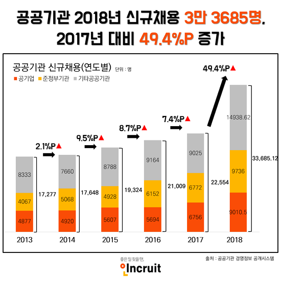 Áö³ 5³â°£ ä¿ë ±Ô¸ð Áõ°¡À²À» »ìÆìº¸¸é 2013³âºÎÅÍ Àü³â ´ëºñ 2.1%P(2014³â), 9.5%P(2015³â), 8.7%(2016³â), 7.4%P(2017³â) Áõ°¡ÇÑ °ÍÀ¸·Î 2014³âºÎÅÍ 2015³â »çÀÌ Å« ÆøÀ¸·Î Áõ°¡Çß´Ù°¡ Á¶±Ý¾¿ ÆøÀÌ ÁÙ¾îµå´Â Ãß¼¼¿´´Ù. ±×·±µ¥ ¿ÃÇØ Á¤ºÎÀÇ °èȹÀ» ÃʰúÇÑ 3¸¸3685¸íÀ» ä¿ëÇÏ°Ô µÇ¸é¼ Áõ°¡ ÆøÀº 49.4%·Î ù µÎ ÀÚ¸´¼ö Áõ°¡ ÆøÀ» ±â·ÏÇß´Ù.