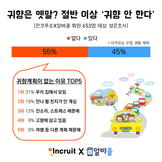 Áö³ 2018³â Ãß¼®¿¡ ÁøÇàÇß´ø ¼³¹®Á¶»ç¿¡¼´Â ±ÍÇâ°èȹÀÌ 47%·Î Áý°èµÈ ¹Ù ÀÖ´Ù. ¿Ã ±¸Á¤ ¿ª½Ã ºñ½ÁÇÑ ÃßÀÌ·Î, ¸íÀý¿¡ ±ÍÇâÇÏÁö ¾Ê´Â ÀÌÀ¯´Â ´Ù¾çÇß´Ù. °¡Àå ¸¹ÀÌ ²ÅÈù Ç׸ñÀº ¡ã¡¯¿ì¸® ÁýÀ¸·Î ¸ðÀÓ¡¯À¸·Î, ÃÑ 31%ÀÇ µæÇ¥¸¦ ¹Þ¾Ò´Ù. Ä£Áö´Â ¸¸³ªµÇ, º»ÀÎÀÌ °ÅÁÖÇÏ´Â °÷¿¡¼ ¸ðÀ̱⠶§¹®¿¡ ±»ÀÌ ±ÍÇâÇÏÁö ¾Ê°Ú´Ù´Â °Í. ÀÌ¾î¼ ¡ã¡¯¸¸³ª·¯ °¥ Ä£Áö°¡ ¾øÀ½(µ¹¾Æ°¡½Å °æ¿ì Æ÷ÇÔ)¡¯(19%), ¡ã¡¯°¡Á· ÀܼҸ®, ½ºÆ®·¹½º°¡ ¿¹»óµÅ¼¡¯(12%) µîÀÇ ÀÌÀ¯°¡ »óÀ§¿¡ ¿Ã¶ú´Ù. ÀÌ ¿Ü¿¡µµ ¡ã¡¯¿©Çà µî ´Ù¸¥ °èȹÀ» ¼¼¿ö¼¡¯, ¡®°íÇâ¿¡¼ Áö³»´Â Áß¡¯(°¢ 9%·Î µ¿·ü), ¡ã¡¯(±ÍÇâÇϸé) ÁöÃâ ºñ¿ëÀÌ Å¬ °ÍÀ¸·Î º¸¿©¼¡¯(7%), ¸¶Áö¸·À¸·Î ¡ã¡¯±Í¼º±æ Á¤Ã¼·Î ¹Ì¸® ´Ù³à¿È¡¯(5%) µîÀÇ »çÀ¯°¡ ±ÍÇâÀ» °¡·Î¸·Àº °ÍÀ¸·Î ³ªÅ¸³µ´Ù. ¼øÀ§±ÇÀº ¾Æ´Ï¾úÁö¸¸ ¡®¾È Ä£ÇØ¼¡¯, ¡®Ãâ±Ù¡¯, ¡®½¬°í ½Í¾î¼¡¯ µîÀÇ ±âŸ´äº¯µµ È®ÀεƴÙ.