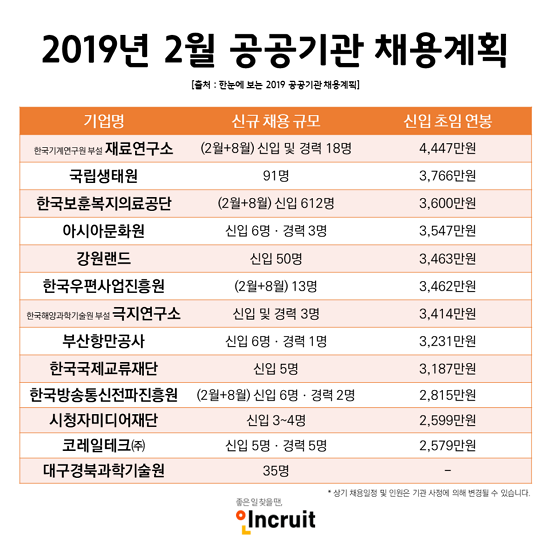 Áö³ 1¿ù ¡®°ø°ø±â°ü ä¿ëÁ¤º¸ ¹Ú¶÷ȸ¡¯¿¡¼ Á¤ºÎ´Â ¿ÃÇØ ÃÑ 2¸¸3õ¿©¸íÀÇ Á¤±ÔÁ÷ ½Å±Ôä¿ëÀ» ÇÏ°Ú´Ù°í ¹àÇû´Ù. ÀÌ´Þ¿¡´Â 13°³ÀÇ °ø°ø±â°ü¿¡¼ ½Å±Ôä¿ëÀ» ÁøÇàÇÒ ¿¹Á¤ÀÎ °¡¿îµ¥, Ãë¾÷Æ÷ÅÐ ÀÎÅ©·çÆ®(´ëÇ¥ ¼¹Ì¿µ www.incruit.com)¿¡¼ ¡®2019³â 2¿ù °ø°ø±â°ü ä¿ë°èȹ¡¯ ¼Ò½ÄÀ» ÀüÇÑ´Ù.
