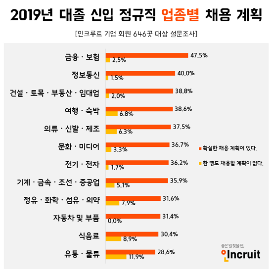 ¿ÃÇØ ´ë±â¾÷ 10°÷ °¡¿îµ¥ 6°÷ ÀÌ»óÀÌ ´ëÁ¹ ½ÅÀÔ»ç¿ø ä¿ëÀ» È®Á¤ ÁöÀº °¡¿îµ¥, °¡Àå È®½ÇÇÑ Ã¤¿ë°èȹÀ» ³»³õÀº °÷Àº ±ÝÀ¶¤ýº¸Çè°ú Á¤º¸Åë½Å ¾÷Á¾ÀÎ °ÍÀ¸·Î È®ÀεƴÙ. Ãë¾÷Æ÷ÅÐ ÀÎÅ©·çÆ®(´ëÇ¥ ¼¹Ì¿µ www.incruit.com)°¡ 646°³ ±â¾÷À» ´ë»óÀ¸·Î ¡®2019³â ´ëÁ¹ ½ÅÀÔ Á¤±ÔÁ÷ ä¿ë °èȹ¡¯¿¡ ´ëÇØ Á¶»çÇÑ °á°ú´Ù.