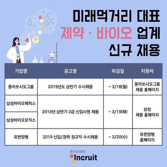 ÃÖ±Ù ´ëÇü ½Å¾à±â¼ú ¼öÃâ µî ÁÁÀº ¼Ò½ÄÀ» µé·ÁÁÖ¸ç ºü¸¥ ¼ºÀå Çຸ¸¦ º¸ÀÌ´Â Á¦¾à¤ý¹ÙÀÌ¿À¾÷°è ÁÖ¿ä ±â¾÷µéÀÌ ÀÎÀ縦 ã°í ÀÖ´Ù. ÇöÀç ä¿ëÀ» ÁøÇà ÁßÀÎ µ¿¾Æ½î½Ã¿À±×·ì¤ý»ï¼º¹ÙÀÌ¿À·ÎÁ÷½º¤ýÀ¯ÇѾçÇàÀÌ ´ëÇ¥ÀûÀ¸·Î, ÀÌµé ±â¾÷ÀÇ 1ÀÎ Æò±Õ±Þ¿©¾×Àº 5,600¸¸¿ø¿¡ À°¹ÚÇÏ´Â °ÍÀ¸·Î Á¶»çµÆ´Ù(DART 2018³â 9¿ù ºÐ±â º¸°í¼ ±âÁØ). ÁÁÀº ÀÏ Ã£À» ¶©, ÀÎÅ©·çÆ®(´ëÇ¥ ¼¹Ì¿µ www.incruit.com)¿¡¼ ¹Ì·¡ ¸Ô°Å¸® »ê¾÷À¸·Î ÁÖ¸ñ¹Þ°í ÀÖ´Â Á¦¾à¤ý¹ÙÀÌ¿À ¾÷°èÀÇ ´ëÇ¥ ±â¾÷ 4°÷ÀÇ »ó¹Ý±â ä¿ë ¼Ò½ÄÀ» ÀüÇÑ´Ù.
