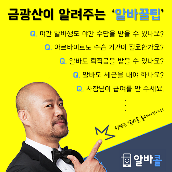 ¶ÇÇÑ, ¾Ë¾ÆµÎ¸é À¯¿ëÇÑ ¾Ë¹Ù»ó½Äµµ ¾ö¼±ÇØ Q&A Çü½ÄÀ¸·Î ¾È³» ÁßÀÌ´Ù. ¡°ÁÖÈÞ¼ö´ç Áö±Þ Á¶°Ç¡±À» ½ÃÀÛÀ¸·Î ¡°¾ß°£ ¾Ë¹Ù»ýµµ ¾ß°£ ¼ö´çÀ» ¹ÞÀ» ¼ö ÀÖ³ª¿ä?¡±, ¡°¾Ë¹Ùµµ ¼¼±ÝÀ» ³»¾ßÇϳª¿ä?¡±, ¡°¾Ë¹Ùµµ ÅðÁ÷±ÝÀ» ¹ÞÀ» ¼ö ÀÖ³ª¿ä?¡°µî ±Þ¿© °ü·Ã ÀÚÁÖ ¹¯´Â Áú¹®ÀÌ ´ëÇ¥ÀûÀ̰í, ±× ¿Ü¿¡µµ ¡°¾Æ¸£¹ÙÀÌÆ®µµ ¼ö½À±â°£ÀÌ ÇÊ¿äÇѰ¡¿ä?¡±, ¡°±Ù·Î°è¾à¼¸¦ ÀÛ¼ºÇÏÁö ¾Ê¾Ò¾î¿ä¡±¿Í °°Àº ±Ù·ÎÁ¶°Ç °ü·Ã»çÇ×, ³¡À¸·Î ¡°ÀÓ±ÝüºÒ¡± , ¡°ºÎ´çÇØ°í¡± µîÀ» °æÇèÇÒ °æ¿ì ¿Ã¹Ù¸¥ ´ëó¹ý°ú ²ÜÆÁÀ» ¾Ë·ÁÁÖ´Â °Í.