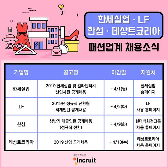 ÃÖ±Ù ¾÷°è ºÒȲÀ¸·Î ÈÀåǰ ½ÃÀå¿¡ µµÀüÀåÀ» ³»¹Ì´Â ÆÐ¼Ç±â¾÷ÀÌ ´Ã°í ÀÖ´Ù. ½Å¼¼°èÀÎÅͳ»¼Å³ÎÀ» ½ÃÀÛÀ¸·Î LF, ÇѼ¶, ÀÌ·£µå ½ºÆÄ¿À°¡ ÈÀåǰ ºê·£µå¸¦ Ãâ½ÃÇ߰ųª Ãâ½Ã¸¦ ¾ÕµÐ °Í. ½ÅÀÔ»ç¿ø ä¿ëµµ Ȱ¹ßÈ÷ ÁøÇà ÁßÀÌ´Ù. ¾Õ¼ »ï¼º¹°»ê ÆÐ¼ÇºÎ¹®Àº ÀÌ´Þ 19ÀÏÀ» ±âÇØ Retail¿µ¾÷°ú °æ¿µÁö¿ø Á÷±º¿¡¼ 3±Þ ½ÅÀÔ»ç¿ø ¼·ùÁ¢¼ö¸¦ ¸¶Ä£ ¹Ù ÀÖ°í, ÇöÀç ÇѼ¼½Ç¾÷, LF, µ¥»óÆ®ÄÚ¸®¾Æ ±×¸®°í Çö´ë¹éÈÁ¡ °è¿ÀÎ ÇѼ¶±îÁö 2019³â »ó¹Ý±â ½ÅÀÔ»ç¿ø ¹× ÀÎÅÏ»ç¿øÀ» ¸ðÁý ÁßÀÎ °Í.