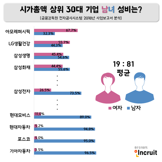 ±¹³» 30´ë ±â¾÷ÀÇ ³²³à¼ººñ´Â Æò±Õ 81´ë 19ÀÎ °ÍÀ¸·Î ³ªÅ¸³ª ½É°¢ÇÑ ¼ººñ ºÒ±ÕÇüÀÌ È®ÀεƴÙ. Ãë¾÷Æ÷ÅÐ ÀÎÅ©·çÆ®(www.incruit.com)°¡ Áö³ÇØ »ç¾÷º¸°í¼¸¦ °ø½ÃÇÑ ½Ã°¡ÃÑ¾× »óÀ§ 30°³ ±â¾÷(±×·ì»ç Æ÷ÇÔ)ÀÇ ÀÓÁ÷¿ø ¼ººñ¸¦ ºÐ¼®ÇÑ °á°ú´Ù.