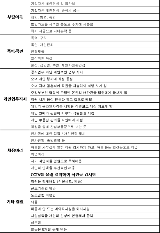 ³¡À¸·Î ¡â¡¯±âŸ¡¯ À¯Çü¿¡¼´Â ¾ÕÀÇ »ç·Êµé°ú´Â ´Þ¸® ºÐ·ùÁ¶Â÷ Èûµç °©Áú ÇàŰ¡ È®ÀεǾú´Ù. ¡®¼ºÃßÇ࡯, ¡®³ú¹°, ¡®³ëÁ¶¼³¸³ ¹Ì½ÂÀΡ¯, ¡®ÀÓ±ÝüºÒ¡¯, ¡®Á÷¿ø ¼±¹°¼¼Æ® °Á¦¸ÅÀÔ¡¯ µî »ç¿¬µµ ´Ù¾çÇß´Ù. ƯÈ÷ ¡®CCTV¸¦ ¸ô·¡ ¼³Ä¡ÇØ Á÷¿øÀ» °¨½ÃÇß´Ù¡¯´Â ´äº¯¿¡¼ Ãæ°ÝÀÌ ÀüÇØÁø´Ù.