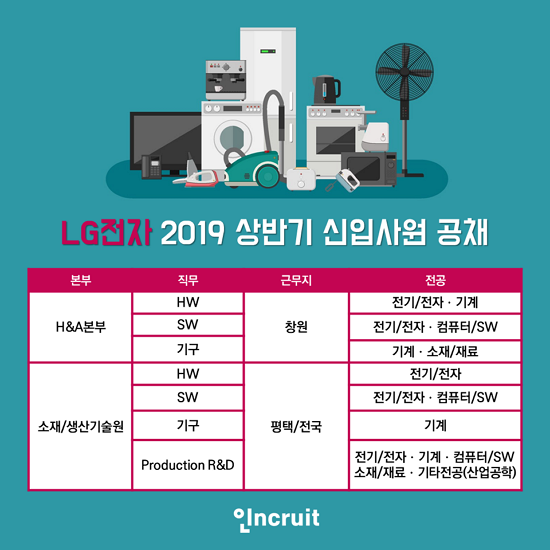 LGÀüÀÚ°¡ 2019³â »ó¹Ý±â ½ÅÀÔ»ç¿ø ¸ðÁý¿¡ ³ª¼¹´Ù. Áö³ 19ÀÏ ÀÚ»ç ä¿ë»çÀÌÆ®ÀÎ LG Careers¿¡¡®2019³â »ó¹Ý±â ½ÅÀÔ»ç¿ø °øÃ¤¡¯ °ø°í¸¦ ¿Ã¸° °Í. »ï¼ºÀ» ÇʵηΠ10´ë ±×·ìÀÌ ÀÏÁ¦È÷ Áö³´Þ ¼·ù¸ðÁý¿¡ ³ª¼± °Í°ú ºñ±³ÇÏ¸é µÚ´ÊÀº Çຸ´Ù. Ãë¾÷Æ÷ÅÐ ÀÎÅ©·çÆ®(www.incruit.com)°¡ ÇØ´ç ¼Ò½ÄÀ» ÀüÇÑ´Ù.