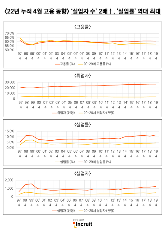Åë°èûÀÌ 15ÀÏ ¹ßÇ¥ÇÑ 2019³â 4¿ù °í¿ëµ¿Çâ¿¡ µû¸£¸é Áö³´Þ ½Ç¾÷ÀÚ´Â 124.5¸¸¸íÀ¸·Î »ç»ó Ãִ븦 ±â·ÏÇß°í, Ãë¾÷ÀÚ Áõ°¡ÆøÀº 10¸¸¸í´ë·Î ÈÄÅðÇß´Ù. ƯÈ÷ ½Ç¾÷ÀÚ¼ö´Â 1997³â IMF¹ß¹ß ÀÌÀüÀÇ 61.6¸¸¸í¿¡¼ µÎ ¹è ´Ã¾î³ °ÍÀ¸·Î ¹àÇôÁ³´Ù. Ãë¾÷Æ÷ÅÐ ÀÎÅ©·çÆ®(´ëÇ¥ ¼¹Ì¿µ www.incruit.com)°¡ Áö³ 22³â°£ÀÇ ´©Àû °í¿ëµ¿ÇâÀ» Àü¼ö Á¶»ç ÇÑ °á°ú´Ù.