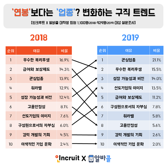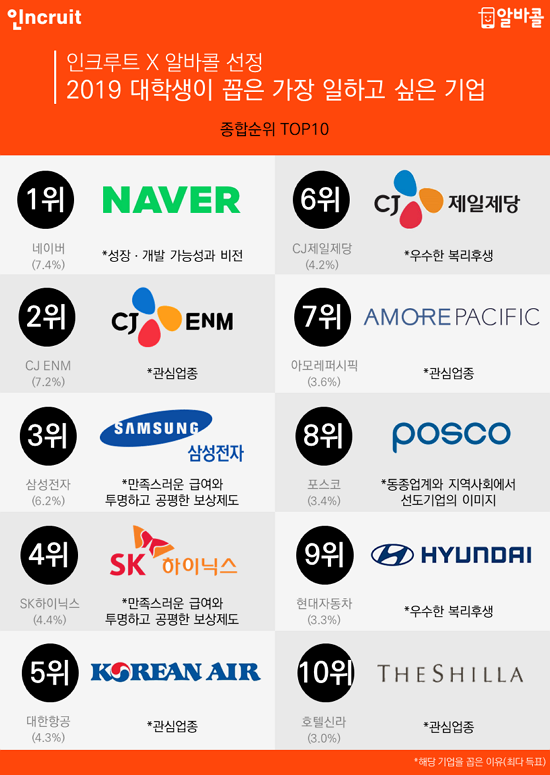 24ÀÏ Ãë¾÷Æ÷ÅÐ ÀÎÅ©·çÆ®(www.incruit.com ´ëÇ¥ ¼¹Ì¿µ)°¡ ¹ßÇ¥ÇÑ ¡®2019 ´ëÇлýÀÌ ²ÅÀº °¡Àå ÀÏÇÏ°í ½ÍÀº ±â¾÷¡¯ TOP10 ¼øÀ§¸¦ ¹ßÇ¥Çß´Ù. ÇØ´ç Á¶»ç´Â Áö³ 2004³â ÀÌÈÄ 16³â° Áö¼Ó ÁßÀÎ ¼³¹® Á¶»ç·Î, ¸ÅÇØ ´ëÇлýµéÀÌ °¡Àå ÀÔ»çÇÏ°í ½Í¾î ÇÏ´Â ±â¾÷°ú ±× ÀÌÀ¯¿¡ ´ëÇØ »ìÆìº½À¸·Î½á ½ÅÀÔ ±¸Á÷ÀÚµéÀÇ ±â¾÷ ¼±È£µµ ¹× ±¸Á÷ Æ®·»µå±îÁö ¹ÝÃßÇØ¿À°í ÀÖ´Ù. 16³â°£ Á¶»ç¸¦ À̾î¿Â °÷Àº ÀÎÅ©·çÆ®°¡ À¯ÀÏÇϸç, ¿ÃÇØ´Â ¹Ù·Î¸éÁ¢ ¾Ë¹Ù¾Û ¾Ë¹ÙÄÝ(albacall.incruit.com)°ú °øµ¿À¸·Î Á¶»çÇß´Ù. ÃÑÂü¿©ÀÚ 1,468¸í Áß ´ëÇлý ȸ¿ø 929¸íÀÇ ÀÀ´äÀ» Âü°íÇß´Ù.