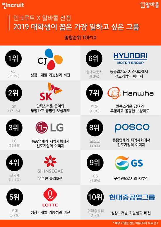 Ãë¾÷Æ÷ÅÐ ÀÎÅ©·çÆ®(www.incruit.com ´ëÇ¥ ¼¹Ì¿µ)°¡ <2019 ´ëÇлýÀÌ ²ÅÀº °¡Àå ÀÏÇÏ°í ½ÍÀº ±×·ì> TOP10À» ¹ßÇ¥Çß´Ù. 2004³â ÀÌÈÄ 16³â° Áö¼ÓÁßÀÎ ¡®´ëÇлýÀÌ ²ÅÀº °¡Àå ÀÏÇÏ°í ½ÍÀº ±â¾÷¡¯ ½Ã¸®Áî´Â ¸ÅÇØ ´ëÇлýµé¸¸À» ´ë»óÀ¸·Î ÁøÇà, ½ÅÀÔ ±¸Á÷ÀÚ°¡ °¡Àå ÀÔ»çÇÏ°í ½Í¾îÇÏ´Â ±â¾÷À» 10À§±îÁö ¼øÀ§ÈÇÏ¿© ¹ßÇ¥ÇØ ¿Ô´Ù. ¿ÃÇØ´Â ¹Ù·Î¸éÁ¢ ¾Ë¹Ù¾Û ¾Ë¹ÙÄÝ(albacall.incruit.com)°ú °øµ¿À¸·Î Á¶»çÇß´Ù. ÃÑ Âü¿©ÀÚ 1,468¸í Áß ´ëÇлý ȸ¿ø 929¸íÀÇ ÀÀ´äÀ» Âü°íÇß´Ù.