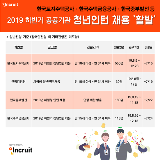 ÀÌ´Þ ÇöÀç Çѱ¹ÅäÁöÁÖÅðø»ç, Çѱ¹ÁÖÅñÝÀ¶°ø»ç, Çѱ¹°¨Á¤¿ø, Çѱ¹ÁߺιßÀü µî ÁÖ¿ä ±â°üÀÇ ÇϹݱâ û³âÀÎÅÏ ¸ðÁýÀÌ ¸¶°¨µÈ´Ù. ¸ÕÀú, 2019³â ÀÎÅ©·çÆ®ÀÇ <´ëÇлýÀÌ ²ÅÀº °¡Àå ÀÏÇÏ°í ½ÍÀº °ø±â¾÷> 5À§·Î ¼±Á¤µÈ LHÀÇ °æ¿ì ÃÑ Ã¤¿ëÀοøÀÌ 550¸íÀÏ Á¤µµ·Î ´ë°Å ¸ðÁýÇÑ´Ù. ¸ðÁýºÐ¾ß´Â ¡ã»ç¹« ¡ã±â¼ú(´Ü, ±Ù¹«±Ç, Á÷±ºÀ» 1°³¸¦ ¼±ÅÃÇØ¼ Áö¿øÇÒ ¼ö ÀÖÀ½ / Áߺ¹Áö¿ø ºÒ°¡)ÀÌ´Ù.