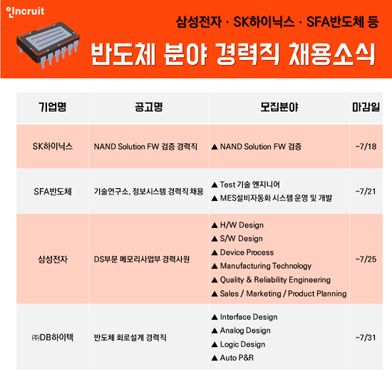 ÀÌ ¿Ü¿¡µµ DBÇÏÀÌÅØ, SFA¹ÝµµÃ¼¿¡¼µµ °¢°¢ °æ·ÂÁ÷À» ¸ðÁý ÁßÀÌ´Ù. ¸ðÁýºÐ¾ß´Â DBÇÏÀÌÅØÀÇ °æ¿ì ¡ãInterface Design ¡ãAnalog Design ¡ãLogic Design ¡ãAuto P&RÀ̸ç, SFA¹ÝµµÃ¼´Â ¡ãTest ±â¼ú ¿£Áö´Ï¾î ¡ãMES¼³ºñÀÚµ¿È ½Ã½ºÅÛ ¿î¿µ ¹× °³¹ß ºÎ¹®ÀÌ ÇØ´çµÈ´Ù.
