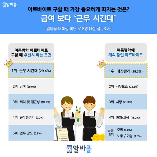 ¿Ã¿©¸§ ´ë´Ù¼öÀÇ ´ëÇлýÀÌ ¾Æ¸£¹ÙÀÌÆ® Àü¼±¿¡ ¶Ù¾îµé °ÍÀ¸·Î º¸ÀÌ´Â °¡¿îµ¥, ¡®±Þ¿©¡¯º¸´Ù ¡®±Ù¹« ½Ã°£´ë¡¯¸¦ ¿ì¼±½ÃÇÏ´Â °ÍÀ¸·Î È®ÀεƴÙ. Ãë¾÷Æ÷ÅÐ ÀÎÅ©·çÆ®°¡ ¿î¿µÇÏ´Â ¹Ù·Î¸éÁ¢ ¾Ë¹Ù¾Û ¾Ë¹ÙÄÝ(albacall.incruit.com)ÀÌ ¼³¹®Á¶»ç ÇÑ °á°ú´Ù.