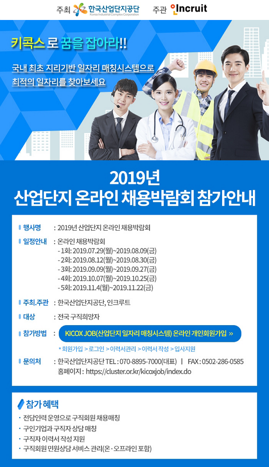 Ãë¾÷Æ÷ÅÐ ÀÎÅ©·çÆ®(´ëÇ¥ ¼¹Ì¿µ www.incruit.com)°¡ ÁÖ°üÇϰí Çѱ¹»ê¾÷´ÜÁö°ø´Ü(ÀÌ»çÀå Ȳ±Ô¿¬)ÀÌ ÁÖÃÖÇÏ´Â ¡®2019 »ê¾÷´ÜÁö ¿Â¶óÀΠä¿ë¹Ú¶÷ȸ¡¯°¡ °³ÃÖ ÁßÀÌ´Ù. Àü±¹ 26°³ »ê¾÷´ÜÁö ÀÏÀÚ¸®Áö¿ø¼¾ÅÍ¿Í ¿¬°èÇÑ ¿Â¶óÀÎ ¸ÅĪ¹Ú¶÷ȸ·Î¼ »ê¾÷´ÜÁöÀÇ ±¸Àΰú ±¸Á÷À» Áö¿øÇÏ´Â ¡®ÀÏÀÚ¸® Å« À塯ÀÌ ¿¸®´Â °ÍÀÌ´Ù.
