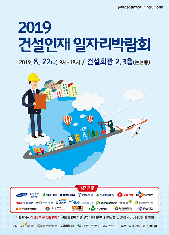 û³â ÀÏÀÚ¸® ±âȸ Á¦°ø°ú °Ç¼³»ê¾÷ ¿ì¼öÀÎÀç È®º¸Áö¿øÀ» À§ÇÏ¿© ¿À´Â 22ÀÏ(¸ñ)¿¡ °³²±¸ ³íÇöµ¿ °Ç¼³È¸°ü¿¡¼ ¡®2019 °Ç¼³ÀÎÀç ÀÏÀÚ¸® ¹Ú¶÷ȸ¡¯¸¦ °³ÃÖÇÑ´Ù. ´ëÇѰǼ³Çùȸ(ȸÀå À¯ÁÖÇö)°¡ ÁÖÃÖÇϰí Ãë¾÷Æ÷ÅÐ ÀÎÅ©·çÆ®(´ëÇ¥ ¼¹Ì¿µ www.incruit.com)°¡ ÈÄ¿øÇÑ´Ù.