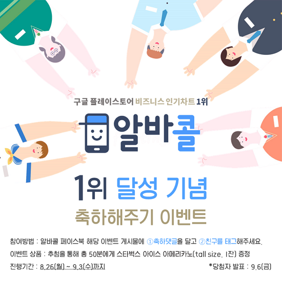 ¹Ù·Î¸éÁ¢ ¾Ë¹Ù¾Û ¾Ë¹ÙÄÝ(albacall.incruit.com ´ëÇ¥ ¼¹Ì¿µ)ÀÌ ¿À´Â 9¿ù 3ÀϱîÁö ±¸±ÛÇ÷¹ÀÌ ÀαâÂ÷Æ® ºñÁî´Ï½º 1À§ ±â³ä À̺¥Æ®¸¦ ÁøÇàÇÑ´Ù.