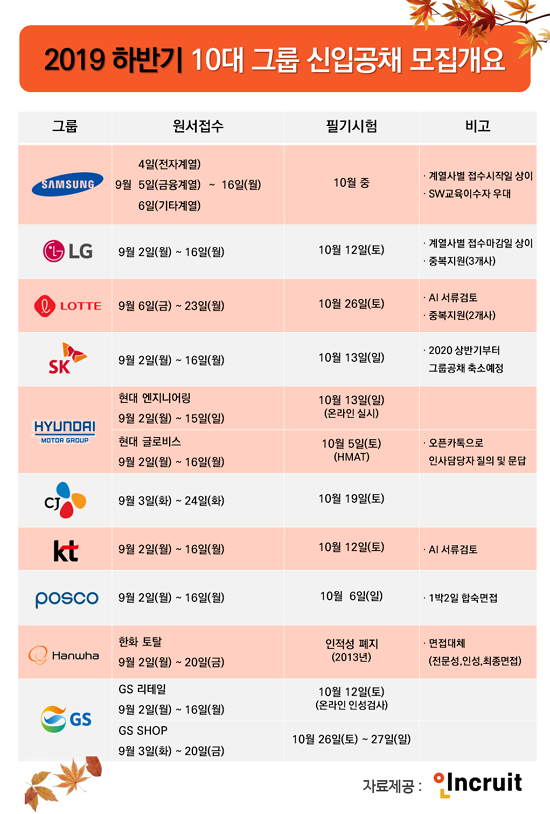 2019 ÇϹݱâ 10´ë ±â¾÷ Àü¿øÀÌ ½ÅÀÔ°øÃ¤¿¡ È´äÇß´Ù. 2ÀÏ LG, SK, Æ÷½ºÄÚ, KT ¹× Çö´ëÀÚµ¿Â÷±×·ì ÀϺΠ°è¿»ç¸¦ ÇʵηΠ3ÀÏ GS¿Í CJ, 6ÀÏÀº ·Ôµ¥, ±×¸®°í ¿À´Ã(4ÀÏ)Àº »ï¼º±×·ìÀÇ ÀüÀڰ迻簡 ¸ðÁýÀ» ½ÃÀÛÇÏ´Â °Í. °è¿»ç·Î Ä«¿îÆ®Çϸé 10´ë±×·ì¿¡¼ ÃÑ 100¿©°÷¿¡ À̸¥´Ù. Ãë¾÷Æ÷ÅÐ ÀÎÅ©·çÆ®(www.incruit.com ´ëÇ¥ ¼¹Ì¿µ)°¡ ÇϹݱâ 10´ë ±â¾÷ ½ÅÀÔ°øÃ¤ ÀÏÁ¤ ¹× Ư¡À» ÀüÇÑ´Ù.