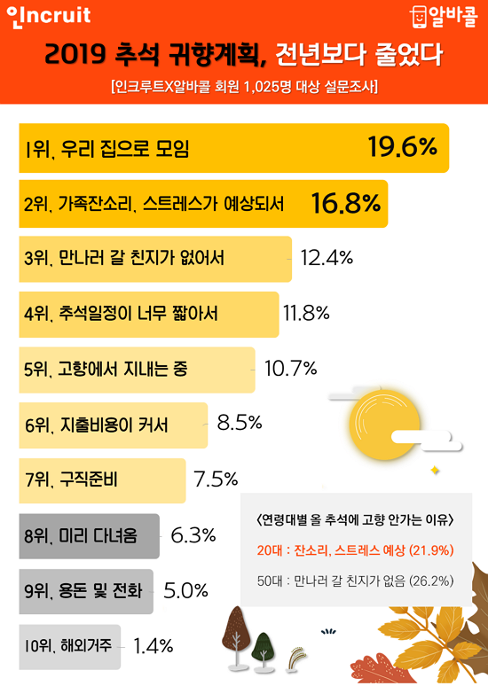 °¡Àå ¸¹ÀÌ ²ÅÈù ÀÌÀ¯´Â ¡ã¡¯¿ì¸® ÁýÀ¸·Î ¸ðÀÓ¡¯À¸·Î ÃÑ 19.6%ÀÇ µæÇ¥¸¦ ¹Þ¾Ò´Ù. Ä£Áö´Â ¸¸³ªµÇ, º»ÀÎÀÌ °ÅÁÖÇÏ´Â °÷¿¡¼ ¸ðÀ̱⠶§¹®¿¡ ±»ÀÌ ±ÍÇâÇÏÁö ¾Ê°Ú´Ù´Â °Í. ÀÌ¾î¼ ¡ã¡¯°¡Á· ÀܼҸ®, ½ºÆ®·¹½º°¡ ¿¹»óµÅ¼¡¯(16.8%) ¡ã¡¯¸¸³ª·¯ °¥ Ä£Áö°¡ ¾øÀ½(µ¹¾Æ°¡½Å °æ¿ì Æ÷ÇÔ)¡¯(12.4%)ÀÌ 2, 3À§¿¡ ²ÅÇû´Ù. ´ÙÀ½À¸·Î´Â ¡ã¡¯À̹ø Ãß¼®ÀÏÁ¤ÀÌ ³Ê¹« ª¾Æ¼¡¯(11.8%) ¡ã¡¯°íÇâ¿¡¼ Áö³»´Â Áß¡¯(10.7%) ¡ã¡¯ÁöÃâºñ¿ëÀÌ Å¬ °ÍÀ¸·Î º¸¿©¼¡¯(8.5%) ¡ã¡¯±¸Á÷Áغñ¡¯(7.5%) ¡ã¡¯±³Åë Á¤Ã¼·Î ¹Ì¸® ´Ù³à¿È¡¯(6.3%) ¡ã¡¯ÀüÈ,¿ëµ·(¼Û±Ý),SNS¾ÈºÎµîÀ¸·Î ´ëü¡¯(5.0%) ¼øÀ¸·Î ¿Ã Ãß¼® °íÇâÀ» °¡Áö ¾Ê´Â ÀÌÀ¯°¡ Áý°èµÆ´Ù.