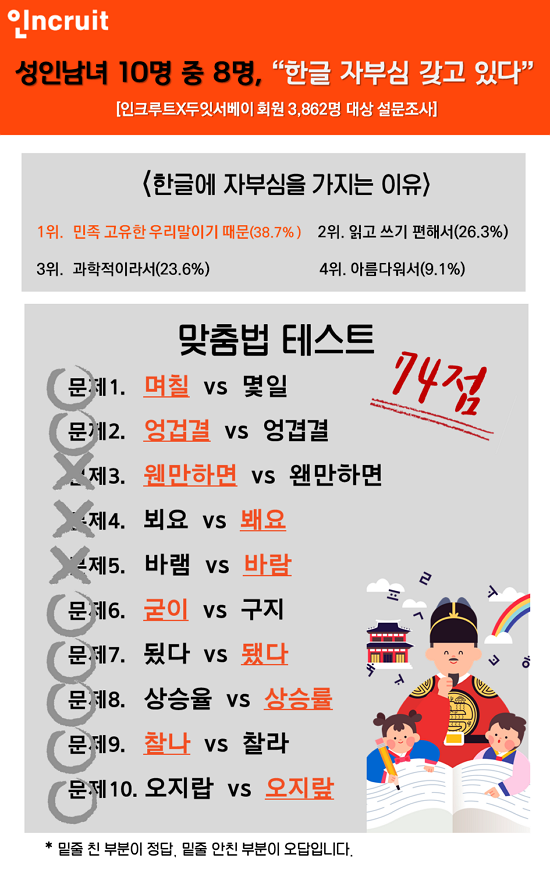 <±×¸². Ãë¾÷Æ÷ÅÐ ÀÎÅ©·çÆ®°¡ Çѱ۳¯À» ±â³äÇØ ½Ç½ÃÇÑ ¸ÂÃã¹ý Å×½ºÆ® °á°ú ¿À´ä·üÀÌ 1/4¿¡ ´ÞÇß´Ù.>