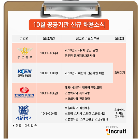 10¿ù °¢Á¾ °ø°ø±â°üÀÇ ½Å±Ô ä¿ëÀÌ ÇÑâÀÌ´Ù. ¼¿ï´ëÇб³ ±³Á÷¿ø ä¿ëÀ» ´ëÇ¥ÀûÀ¸·Î Çѱ¹³²µ¿¹ßÀü°ú Çѱ¹Àü·Â°ø»ç´Â °¢°¢ ½ÅÀÔ»ç¿ø°ú ÀÎÅÏÀ», °ø±ºº»ºÎ´Â °ø°³°æÀï ä¿ë½ÃÇèµµ ¾ÕµÎ°í ÀÖ´Ù. Ãë¾÷Æ÷ÅÐ ÀÎÅ©·çÆ®(´ëÇ¥ ¼¹Ì¿µ www.incruit.com)°¡ 10¿ù ¿ø¼Á¢¼ö ÁßÀÎ °ø°ø±â°ü ½Å±Ô ä¿ë ¼Ò½ÄÀ» ÀüÇÑ´Ù.