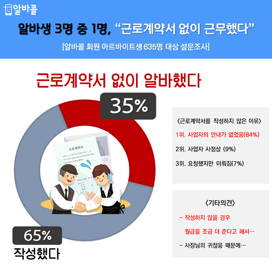 ¾Ë¹Ù»ý 3¸í Áß 1¸íÀº ±Ù·Î°è¾à¼¸¦ ÀÛ¼ºÇÏÁö ¾Ê´Â °ÍÀ¸·Î ³ªÅ¸³µ´Ù. »ç¾÷Àå¿¡ ¿äûÇßÁö¸¸ °ÅÀý´çÇÑ °æ¿ìµµ ÀÖ¾ú´Ù. ÀÎÅ©·çÆ®°¡ ¿î¿µÇÏ´Â ¹Ù·Î¸éÁ¢ ¾Ë¹Ù¾Û ¾Ë¹ÙÄÝ(albacall.incruit.com ´ëÇ¥ ¼¹Ì¿µ)ÀÌ ÃÖ±Ù 1³â°£ ¾Æ¸£¹ÙÀÌÆ® ±Ù¹« °æÇèÀÌ Àִ ȸ¿ø 635¸íÀ» ´ë»óÀ¸·Î ¼³¹® Á¶»çÇÑ °á°ú´Ù. 95% ½Å·Ú¼öÁØ¿¡ Ç¥º»¿ÀÂ÷´Â ¡¾4.12%ÀÌ´Ù.