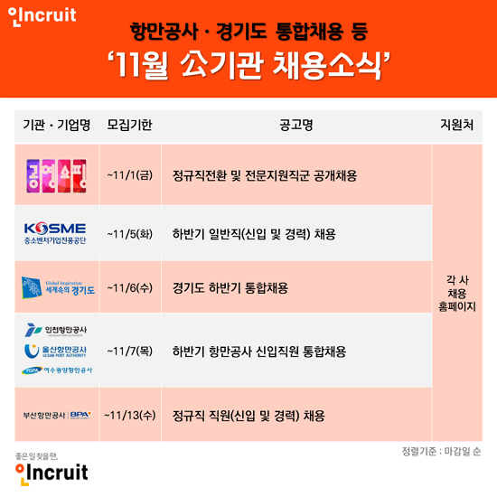 ¿À´Â 11¿ù °¢Á¾ °ø°ø±â°ü°ú °ø±â¾÷ÀÇ ½Å±Ô ä¿ëÀÌ ÇÑâÀÌ´Ù. ÇöÀç Ç׸¸°ø»ç¿Í °æ±âµµ °ø°ø±â°üÀº ÅëÇÕä¿ëÀ», Áß¼Òº¥Ã³±â¾÷ÁøÈï°ø´ÜÀº ÇϹݱâ Á¤±ÔÁ÷À» ¸ðÁý ÁßÀÌ´Ù. Ãë¾÷Æ÷ÅÐ ÀÎÅ©·çÆ®(´ëÇ¥ ¼¹Ì¿µ www.incruit.com)°¡ ¼·ù ¸¶°¨À» ¾ÕµÐ °ø°ø±â°ü ¹× °ø±â¾÷(Ç׸¸°ø»ç¤ý°æ±âµµ°ø°ø±â°üÅëÇÕä¿ë¤ýÁß¼Òº¥Ã³±â¾÷ÁøÈï°ø´Ü¤ý°ø¿µÈ¨¼îÇÎ)ÀÇ Ã¤¿ë ¼Ò½ÄÀ» Çѵ¥ ¸ð¾Ò´Ù.