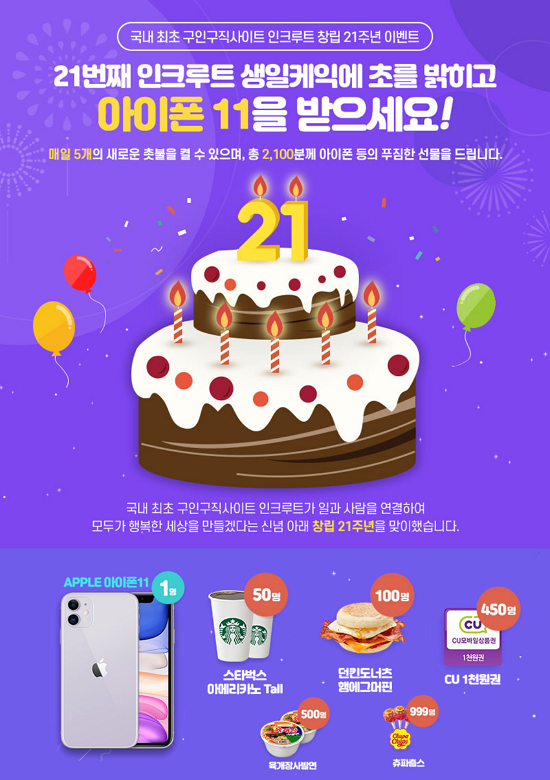 ÁÁÀº ÀÏ Ã£À» ¶© Ãë¾÷Æ÷ÅÐ ÀÎÅ©·çÆ®(´ëÇ¥ ¼¹Ì¿µ www.incruit.com)°¡ ÀÌ´Þ Ã¢¸³ 21ÁÖ³âÀ» ±â³äÇØ À̺¥Æ®¸¦ ÁøÇàÇÑ´Ù. À̺¥Æ® ±â°£ ³» Áï¼®´ç÷À» ÅëÇØ ÃÑ 2,100¸í¿¡°Ô ǪÁüÇÑ °æÇ°À» Á¦°øÇϰí, ±× °¡¿îµ¥ 1¸í¿¡°Ô´Â Ãß÷À» ÅëÇØ ¾ÆÀÌÆù11À» ÁõÁ¤ÇÑ´Ù.