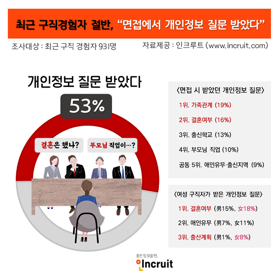 Áö³ 7¿ù °³Á¤ ä¿ëÀýÂ÷¹ý ½ÃÇàÀ¸·Î ¸éÁ¢ ½Ã Á÷¹«¼öÇà°ú ¹«°üÇÑ °³ÀÎÁ¤º¸ ¿ä±¸°¡ ±ÝÁöµÆÁö¸¸, ½Ç»óÀº ±×·¸Áö ¾Ê¾Ò´Ù. ÃÖ±Ù ±¸Á÷°æÇèÀÚ Áß Àý¹Ý ÀÌ»óÀº ¸éÁ¢½Ã °³ÀÎÁ¤º¸ Áú¹®À» ¹ÞÀº °ÍÀ¸·Î È®ÀεƱ⠶§¹®. ƯÈ÷ ¿©¼º±¸Á÷ÀÚ°¡ °¡Àå ¸¹ÀÌ ¹ÞÀº Áú¹®Àº °áÈ¥¿©ºÎÀÎ °ÍÀ¸·Î ³ªÅ¸³µ´Ù.