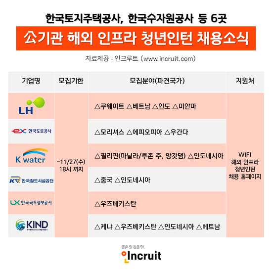 ÀÌ´Þ °ø±â¾÷ 6°÷¿¡¼ °øµ¿À¸·Î ÇØ¿ÜÀÎÇÁ¶ó û³âÀÎÅÏÀ» ¼±¹ßÇÑ´Ù.ÇØ¿Ü°Ç¼³Çùȸ¿Í Çѱ¹ÅäÁöÁÖÅðø»ç(LH), Çѱ¹¼öÀÚ¿ø°ø»ç, Çѱ¹µµ·Î°ø»ç, Çѱ¹Ã¶µµ½Ã¼³°ø´Ü, Çѱ¹±¹ÅäÁ¤º¸°ø»ç, Çѱ¹ÇØ¿ÜÀÎÇÁ¶óµµ½Ã°³¹ßÁö¿ø°ø»ç°¡ °øµ¿À¸·Î ÁøÇàÇÏ´Â ¡®WIFI(World Infra Frontier Internship) ÇØ¿ÜÀÎÇÁ¶ó û³â ÀÎÅϽʡ¯ÀÌ ±×°ÍÀ¸·Î, ÃÑ 12°³±¹ 13°³ µµ½ÃÀÇ ±Û·Î¹ú ÀÎÅÏ 25¸íÀ» ä¿ëÇÑ´Ù.