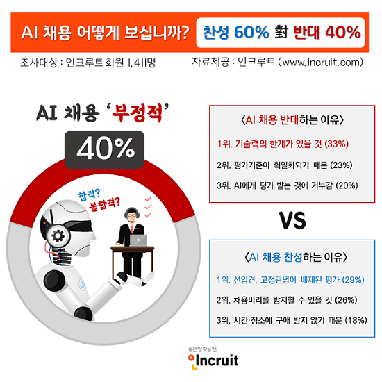 ÇÏÁö¸¸ ¹Ý´ëÀÌÀ¯µµ ÆØÆØÇß´Ù. °¡Àå Å« ÀÌÀ¯´Â ¡®±â¼ú·ÂÀÇ ÇѰ衯(33%) ¶ó´Â Á¡À̾ú´Ù. ¾Õ¼ Âù¼ºÀÔÀå Áß 4Â÷ »ê¾÷Çõ¸í ½Ã´ë¿¡ ¾î¿ï¸®´Â ä¿ë½Ã½ºÅÛÀ̶ó´Â Á¡°ú ´ëÁ¶µÇ´Â ºÎºÐÀ¸·Î, ¾ÆÁ÷Àº AI°¡ »ç¶÷À» »Ì°í ¶Ç´Â ¶³¾î¶ß¸®±â¿¡´Â ±â¼ú·ÂÀÌ ¹ÌÄ¡Áö ¸øÇÑ´Ù°í ¿©±â´Â °Í. ´ÙÀ½À¸·Î ¡®Æò°¡±âÁØÀÌ È¹ÀÏȵDZ⠶§¹®¿¡¡¯(23%), ¡®ÄÄÇ»ÅÍ¿¡°Ô Æò°¡¹Þ´Â °Í¿¡ ´ëÇØ °ÅºÎ°¨ÀÌ µé¾î¼¡¯(20%) µîÀÇ ¹Ý´ëÀÌÀ¯°¡ À̾îÁ® »ç¶÷Àº »ç¶÷ÀÌ »Ì¾Æ¾ß ÇÑ´Ù´Â ÀÔÀå¿¡ ÈûÀ» ½Ç¾ú´Ù. ¶ÇÇÑ, ÃÔ¿µÀ¸·Î ¾ó±¼ÀÌ ±â·Ï¿¡ ³²´Â µî ¡®°³ÀÎÁ¤º¸ À¯Ãâ,º¸¾È ¿ì·Á¡¯(11%), Çìµå¼Â ¹× À¥Ä·À» °®Ãç¾ßÇϰí, PC¹æ¿¡¼´Â ¸éÁ¢¿¡ ÁýÁßÇÒ ¼ö ¾ø´Â µîÀÇ ¡®¸éÁ¢È¯°æÀ» ¼¼ÆÃÇØ¾ß ÇÏ´Â ¹ø°Å·Î¿ò¡¯(7%), ³¡À¸·Î ¡®Ã¤¿ëÀüÇüÀÌ ¶Ç Çϳª ´Ã¾î³ª ´ëºñÇÒ °Ô ¸¹¾ÆÁü¡¯(5%), ¡®Àμº Æò°¡±îÁö´Â ºÒ°¡ÇÒ °Í¡¯(±âŸ) µî ¹Ý´ë ÀǰßÀÌ À̾îÁ³´Ù.