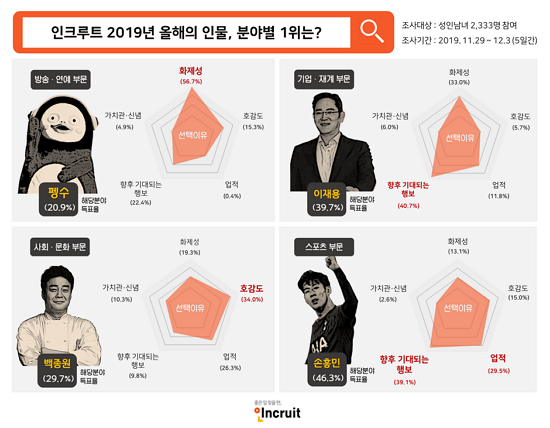 ±âÇØ³â ÇÑ ÇØ°¡ Àú¹°¾î °¡´Â °¡¿îµ¥ Ãë¾÷Æ÷ÅÐ ÀÎÅ©·çÆ®(´ëÇ¥ ¼¹Ì¿µ www.incruit.com)°¡ ¿ÃÇØ Àλó ±í¾ú´ø Àι°·Î ÇÑ ÇØ¸¦ µÇµ¹¾Æº¸°íÀÚ ¡®2019 ¿ÃÇØÀÇ Àι°¡¯ Á¶»ç¸¦ ½Ç½ÃÇß´Ù. ±× °á°ú 2019³â ºÐ¾ßº° ¿ÃÇØÀÇ Àι°¿¡ Æë¼ö, ¼Û°¡ÀÎ, ºÀÁØÈ£ µîÀÌ ²ÅÇû´Ù.