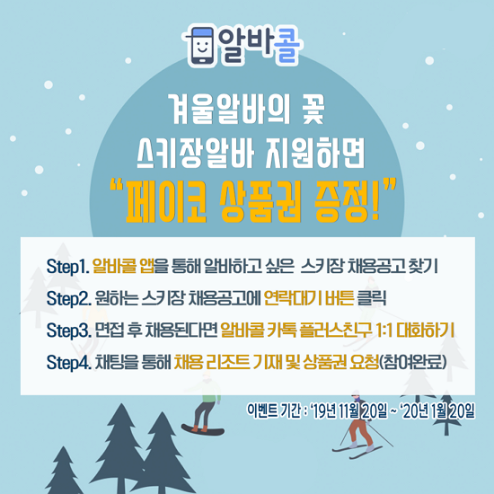 Âü¿©¹æ¹ýÀº °£´ÜÇÏ´Ù. À̺¥Æ® ±â°£ ³» ¾Ë¹ÙÄÝ ¾ÛÀ» ÅëÇØ ½ºÅ°Àå ¾Æ¸£¹ÙÀÌÆ®¸¦ °Ë»ö, ¿øÇÏ´Â °ø°í ³» ¡®¿¬¶ô´ë±â¡¯ ¹öưÀ» Ŭ¸¯ÇÏ¿© ¸éÁ¢¿¡ Áö¿øÇÏ¸é µÇ´Â °Í. ÀÌÈÄ Ã¤¿ëÀÌ ¿Ï·áµÇ¸é ¾Ë¹ÙÄÝ Ç÷¯½ºÄ£±¸¸¦ ÅëÇØ ä¿ë ¸®Á¶Æ® »óÈ£¿Í ÇÔ²² ÆäÀÌÄÚ »óǰ±Ç ¿äûÀ» ÇÏ¸é µÈ´Ù. À̺¥Æ® ±â°£Àº ´ÙÀ½ ´Þ 20ÀϱîÁö, ¸ðµç Âü¿©ÀÚ¿¡°Ô ÆäÀÌÄÚ ¸¸¿ø »óǰ±ÇÀ» 100% ¹ß¼ÛÇÑ´Ù.