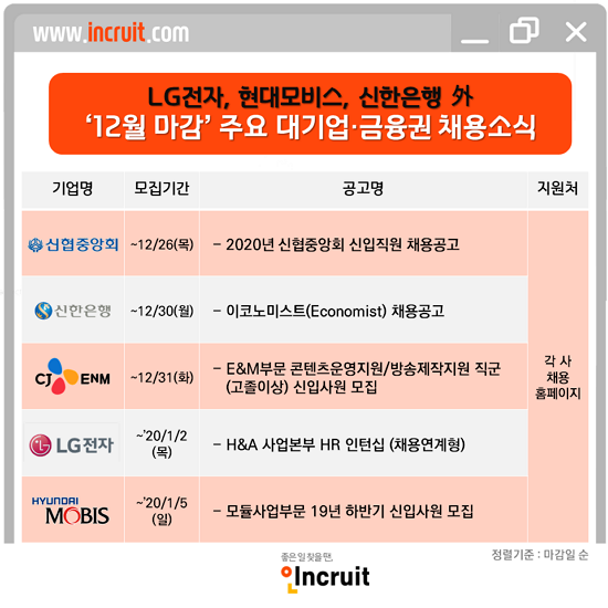 ¿¬¸»ºÎÅÍ ½Å³â±îÁö ä¿ë½ÃÀåÀº ¿©ÀüÈ÷ ¶ß°Ì´Ù. LGÀüÀÚ, Çö´ë¸ðºñ½º, ½ÅÇÑÀºÇà µî ÁÖ¿ä ´ë±â¾÷ ¹× ±ÝÀ¶±Ç¿¡¼ ½ÅÀÔ»ç¿ø, ÀÎÅÏ»ç¿øÀ» ¸ðÁý ÁßÀÎ °Í. ÀÌ¿¡ Ãë¾÷Æ÷ÅÐ ÀÎÅ©·çÆ®(www.incruit.com ´ëÇ¥ ¼¹Ì¿µ)°¡ ¿¬¸»¿¡ ¸¶°¨ ÁßÀΠä¿ë¼Ò½ÄÀ» ÀüÇÑ´Ù. ¿Ã ¿¬¸» °¡Àå ºü¸£°Ô ä¿ëÀ» ÁøÇàÇÏ´Â ¾÷°èÀÎ ¸¸Å Èñ¸Á ±¸Á÷ÀÚ¶ó¸é ¹ß ºü¸¥ Áö¿øÀÌ Çʼö´Ù.