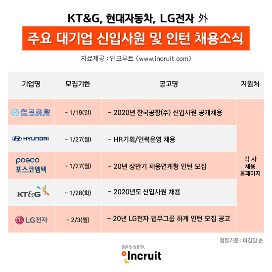 20200117- 1¿ù ÇöÀç ä¿ëÁßÀÎ ´ë±â¾÷ ¾îµð? KT&G¡¤Çѱ¹°øÇ× ½ÅÀÔ»ç¿ø, Çö´ëÀÚµ¿Â÷¡¤Æ÷½ºÄÚ¿¥ÅØ HRºÎ¹® ½ÅÀÔ ¹× ÀÎÅÏ, LGÀüÀÚ ÇϰèÀÎÅÏ °¢°¢ ¸ðÁýÁß