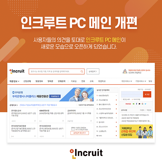 Ãë¾÷Æ÷ÅÐ ÀÎÅ©·çÆ®(´ëÇ¥ ¼¹Ì¿µ www.incruit.com)°¡ Áö³´Þ 30ÀÏ Ã¤¿ëÁ¤º¸¸¦ ÇÑ´«¿¡ È®ÀÎÇÒ ¼ö ÀÖµµ·Ï PC ¸ÞÀΠȨÆäÀÌÁö¸¦ °³ÆíÇß´Ù. »ó¹Ý±â °øÃ¤ ½ÃÁð °³¸·À» ¾ÕµÎ°í »ç¿ëÀÚ ÆíÀǼºÀ» ´Ã¸° °Í.
