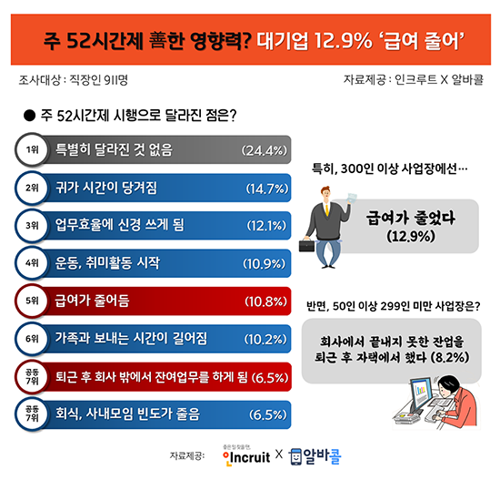 ÁÖ 52½Ã°£Á¦ ½ÃÇà ÀÌÈÄ Á÷ÀåÀÎ Àý¹Ý ÀÌ»óÀº »îÀÇ ÁúÀÌ Çâ»óµÆ´Ù°í ´äÇßÁö¸¸ ´ë±â¾÷ ÀçÁ÷ÀÚ ÀϺδ ±Þ¿© °¨¼Ò¸¦ ´ÜÁ¡À¸·Î ÁöÀûÇß´Ù. Ãë¾÷Æ÷ÅÐ ÀÎÅ©·çÆ®(´ëÇ¥ ¼¹Ì¿µ www.incruit.com)¿Í ¹Ù·Î¸éÁ¢ ¾Ë¹Ù¾Û ¾Ë¹ÙÄÝ(albacall.incruit.com)ÀÌ Á÷ÀåÀÎ 911¸íÀ» ´ë»óÀ¸·Î ¼³¹®Á¶»çÇÑ °á°ú´Ù.