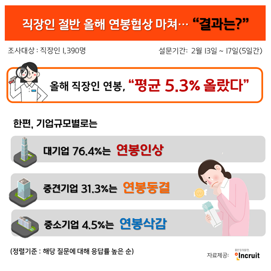 Á÷ÀåÀÎ Àý¹ÝÀº ¿ÃÇØ³âµµ ¿¬ºÀÇù»óÀ» ¸¶Ä£ °ÍÀ¸·Î Á¶»çµÆ´Ù. ¿ÃÇØ ¿¬ºÀ Àλó·üÀº Æò±Õ 5.3%·Î Áö³Çغ¸´Ù ³ô¾ÒÁö¸¸ Á÷ÀåÀεéÀÇ ±â´ë ¼öÁØ¿¡´Â ¹ÌÄ¡Áö ¸øÇß´Ù. Ãë¾÷Æ÷ÅÐ ÀÎÅ©·çÆ®(´ëÇ¥ ¼¹Ì¿µ www.incruit.com)¿Í ¹Ù·Î¸éÁ¢ ¾Ë¹Ù¾Û ¾Ë¹ÙÄÝÀÌ Á÷ÀåÀÎ 1,390¸íÀ» ´ë»óÀ¸·Î ÁøÇàÇÑ ¼³¹®Á¶»ç °á°ú´Ù. ÀÌ´Þ 13ÀϺÎÅÍ 17ÀϱîÁö ´å»õ°£ Á¶»çÇß´Ù.