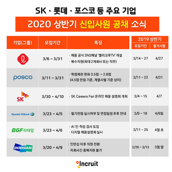 <±×¸². Ãë¾÷Æ÷ÅÐ ÀÎÅ©·çÆ®°¡ ·Ôµ¥, Æ÷½ºÄÚ, SK µî ÁÖ¿ä ±â¾÷ÀÇ 2020 »ó¹Ý±â ½ÅÀÔ°øÃ¤ ¼Ò½ÄÀ» ¾È³»ÇÑ´Ù.>