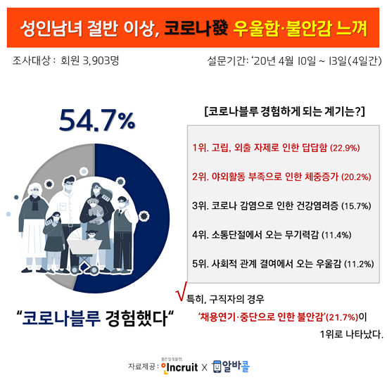 Äڷγª19 »çŰ¡ Àå±âȵʿ¡ µû¶ó ¼ºÀγ²³à Àý¹Ý ÀÌ»óÀº ºÒ¾È°¨°ú ¿ì¿ï°¨, Áï Äڷγª ºí·ç¸¦ °æÇèÇÑ °ÍÀ¸·Î Á¶»çµÆ´Ù. Ãë¾÷Æ÷ÅÐ ÀÎÅ©·çÆ®(´ëÇ¥ ¼¹Ì¿µ www.incruit.com)¿Í ¹Ù·Î¸éÁ¢ ¾Ë¹ÙÄÝÀÌ ¼ºÀγ²³à 3903¸íÀ» ´ë»óÀ¸·Î °øµ¿ ¼³¹® Á¶»çÇÑ °á°ú´Ù.