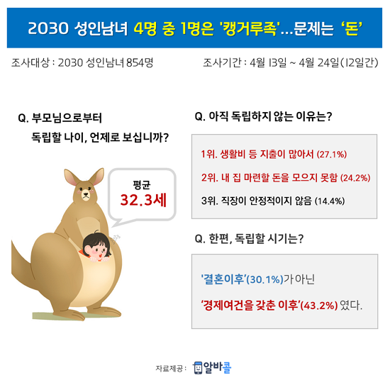 <±×¸². ¹Ù·Î¸éÁ¢ ¾Ë¹Ù¾Û ¾Ë¹ÙÄÝ Á¶»ç°á°ú, 2030 ¼ºÀγ²³à°¡ ºÎ¸ð´ÔÀ¸·ÎºÎÅÍ µ¶¸³ÇÒ ³ªÀÌ´Â Æò±Õ 32.3¼¼·Î Á¶»çµÆ´Ù.>
