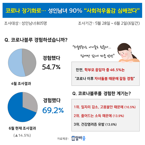 Äڷγª19 »çÅ Àå±âÈ¿¡ µû¶ó Äڷγªºí·çµµ ½ÉÇØÁ® ÀϺδ Àü¹®ÀÇ »ó´ãµµ ¹ÞÀº °ÍÀ¸·Î È®ÀεƴÙ. Ãë¾÷Æ÷ÅÐ ÀÎÅ©·çÆ®°¡ ¿î¿µÇÏ´Â ¹Ù·Î¸éÁ¢ ¾Ë¹Ù¾Û ¾Ë¹ÙÄÝ(´ëÇ¥ ¼¹Ì¿µ albacall.incruit.com)ÀÌ ¼ºÀγ²³à 805¸íÀ» ´ë»óÀ¸·Î ¡®Äڷγªºí·ç ÃßÀ̺¯È¡¯¿¡ ´ëÇØ ¼³¹®Á¶»çÇÑ °á°ú´Ù.
