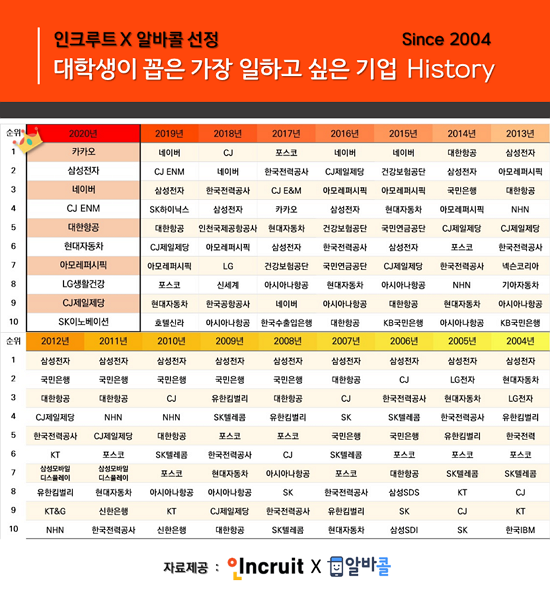 <Ç¥2. ÀÎÅ©·çÆ®X¾Ë¹ÙÄÝ ¼±Á¤ ¡®´ëÇлýÀÌ ²ÅÀº °¡Àå ÀÏÇÏ°í ½ÍÀº ±â¾÷¡¯ Áö³ È÷½ºÅ丮_Since 2004>