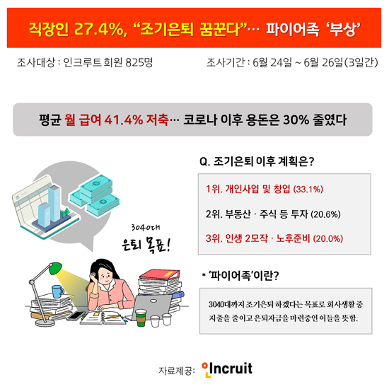30´ë Á÷ÀåÀÎ 3¸í Áß 1¸íÀº Á¶±âÀºÅ𸦠¸ñÇ¥·Î ÀÏÇÏ´Â ¡®ÆÄÀ̾îÁ·¡¯À¸·Î ƯÈ÷ Äڷγª ÀÌÈÄ ¿ëµ·µµ 30% ÁÙÀÎ °ÍÀ¸·Î È®ÀεƴÙ. Ãë¾÷Æ÷ÅÐ ÀÎÅ©·çÆ®(´ëÇ¥ ¼¹Ì¿µ www.incruit.com)°¡ ¡®ÆÄÀ̾îÁ·¡¯À» ÁÖÁ¦·Î Á÷ÀåÀÎ ´ë»ó ¼³¹®Á¶»ç ÁøÇà °á°ú´Ù.