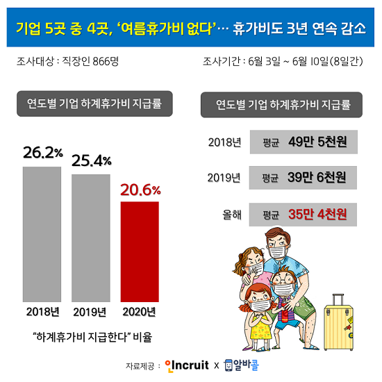 ±â¾÷¿¡¼ Áö±ÞÇÏ´Â ¿©¸§ÈÞ°¡ºñ°¡ 3³â ¿¬¼Ó ÁÙ¾îµç °ÍÀ¸·Î Á¶»çµÆ´Ù. Ãë¾÷Æ÷ÅÐ ÀÎÅ©·çÆ®(´ëÇ¥ ¼¹Ì¿µ www.incruit.com)¿Í ¹Ù·Î¸éÁ¢ ¾Ë¹Ù¾Û ¾Ë¹ÙÄÝÀÌ Á÷ÀåÀÎ 866¸íÀ» ´ë»óÀ¸·Î ¡®2020 ¿©¸§ÈÞ°¡¡¯¿Í °ü·ÃÇØ °øµ¿ Á¶»çÇÑ °á°ú´Ù.