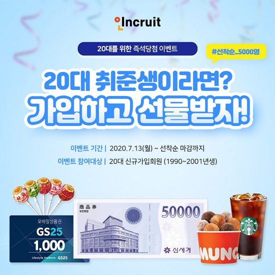 Ãë¾÷Æ÷ÅÐ ÀÎÅ©·çÆ®(´ëÇ¥ ¼¹Ì¿µ www.incruit.com)°¡ ¡®20´ë ÃëÁØ»ýÀ̶ó¸é? °¡ÀÔÇÏ°í ¼±¹°¹ÞÀÚ!¡¯ À̺¥Æ®¸¦ Áö³ 13ÀÏ ½ÃÀÛÇß´Ù. 20´ë ½Å±Ô°¡ÀÔ È¸¿øÀ» ´ë»óÀ¸·Î, ¹éÈÁ¡ »óǰ±Ç ¿À¸¸¿ø±Ç ¿Ü ½ºÅ¸¹÷½º, ´øÅ²µµ³ÊÃ÷ ±âÇÁƼÄÜ, ÆíÀÇÁ¡ »óǰ±Ç µî ǪÁüÇÑ °æÇ°À» 100% ÁõÁ¤ÇÑ´Ù.