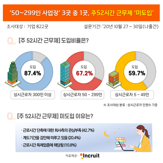 50~299ÀÎ Áß¼Ò±â¾÷¿¡ ´ëÇÑ ÁÖ 52½Ã°£ ±Ù¹«Á¦ °èµµ±â°£ Á¾·á¸¦ ¾ÕµÐ °¡¿îµ¥, 3°÷ Áß 1°÷Àº ¾ÆÁ÷ µµÀÔÁ¶Â÷ ÇÏÁö ¾ÊÀº °ÍÀ¸·Î È®ÀεƴÙ. Ãë¾÷Æ÷ÅÐ ÀÎÅ©·çÆ®(´ëÇ¥ ¼¹Ì¿µ albacall.incruit.com)°¡ ±â¾÷ 822°÷À» ´ë»óÀ¸·Î ÁÖ52½Ã°£Á¦ µµÀÔ½ÇÅ¿¡ ´ëÇØ ÆÄ¾ÇÇÑ °á°ú´Ù.