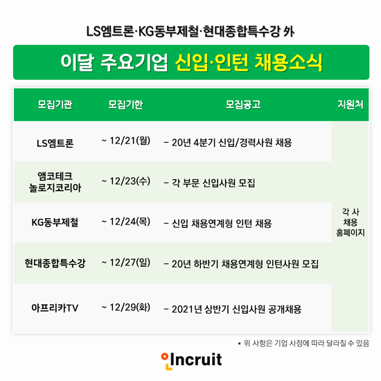 ¸Å¼¿î ÇÑÆÄ ¼Ó¿¡¼µµ ½ÅÀÔä¿ëÀº °è¼ÓµÇ°í ÀÖ´Ù. ÇöÀç ¾ÚÄÚÅ×Å©³î·ÎÁöÄÚ¸®¾Æ, LS¿¥Æ®·Ð, KGµ¿ºÎÁ¦Ã¶, Çö´ëÁ¦Ã¶Æ¯¼ö°, ¾ÆÇÁ¸®Ä«TVµî¿¡¼ ´ëÁ¹ ½ÅÀÔ ¹× ÀÎÅÏ»ç¿øÀ» ¸ðÁý ÁßÀÎ °Í. À̸£¸é ³»´ÞºÎÅÍ ½ÅÀÔ»ç¿øÀ¸·Î¼ ÀԻ簡 °¡´ÉÇÑ ¸¸Å, Ãë¾÷Áغñ»ýÀ̶ó¸é ¿¬¸» Á¢¼ö¿¡ ¼Óµµ¸¦ ³»º¼ °ÍÀ» ÃßõÇÑ´Ù. ÀÌ¿¡ Ãë¾÷Æ÷ÅÐ ÀÎÅ©·çÆ®(´ëÇ¥ ¼¹Ì¿µ www.incruit.com)°¡ ÀÌ´Þ ¸ðÁýÁßÀÎ ÁÖ¿ä±â¾÷ ´ëÁ¹½ÅÀÔ ¹× ÀÎÅÏ Ã¤¿ë¼Ò½ÄÀ» ¾È³»ÇÑ´Ù.