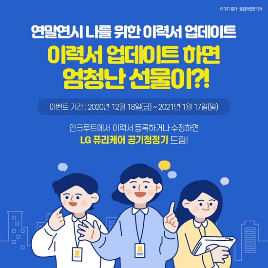 ÀÌ¿¡ Ãë¾÷Æ÷ÅÐ ÀÎÅ©·çÆ®(´ëÇ¥ ¼¹Ì¿µ www.incruit.com)°¡ ¿¬¸»¿¬½Ã À̷¼ ¾÷µ¥ÀÌÆ®ÀÇ Á߿伺À» ¾Ë¸®°í µ¶·ÁÇϱâ À§ÇØ ¿¬¸»¿¬½Ã, ³ª¸¦ À§ÇÑ À̷¼ ¾÷µ¥ÀÌÆ® À̺¥Æ®¸¦ ½Ç½ÃÇÑ´Ù.