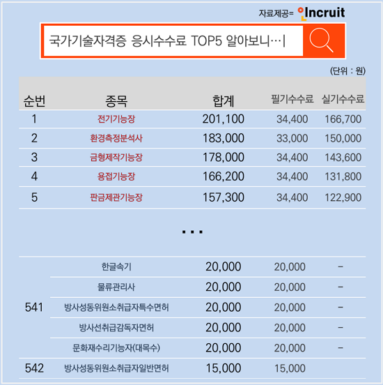 Ãë¾÷Æ÷ÅÐ ÀÎÅ©·çÆ®(www.incruit.com ´ëÇ¥ ¼¹Ì¿µ)°¡ ±¹°¡±â¼úÀÚ°Ý Á¾¸ñ 542°³ÀÇ ½ÃÇè ÀÀ½Ã ¼ö¼ö·á¸¦ Àü¼ö Á¶»çÇß´Ù. ±× °á°ú, °¡Àå ³ôÀº ÀÀ½Ã ¼ö¼ö·á¿¡´Â 'Àü±â±â´ÉÀå'ÀÌ µµÇÕ ¼ö¼ö·á 201,100¿øÀ¸·Î 1À§¿¡ ¿Ã¶ú´Ù. ÀÌ´Â Àü±â ±â´É°è ±â¼úÀÚ°Ý µî±ÞÀÇ Çϳª·Î, ±â´É»çÀÇ ÃÖ»ó µî±Þ¿¡ ÇØ´çÇÏ´Â ÀÚ°ÝÀÌ´Ù. º¸Åë '±â´ÉÀå'ÀÇ ÀÀ½ÃÀÚ°ÝÀ» ÃëµæÇÏ·Á¸é ±â´É»ç 1±Þ ÀÚ°ÝÀ» ¾ò°í, ±â´É ´ëÇÐÀ» Á¹¾÷ÇÑ µÚ ÇØ´ç ºÐ¾ß¿¡¼ 7³â ÀÌ»ó Á¾»çÇÑ »ç¶÷¸¸ÀÌ ±â´ÉÀå ½ÃÇèÀ» Ä¡¸¦ ¼ö ÀÖ´Â °ÍÀ¸·Î ¾Ë·ÁÁ® ÀÖ´Ù.